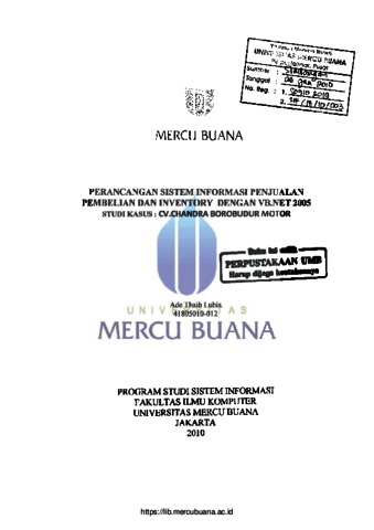 Perkembangan teknologi dan informasi semakin lama semakin berkembang, penggunaan komputer dalam bidang bisnis bagi para pengusaha sudah merupakan hal yang umum. Komputer banyak digunakan sebagai alat bantu dalam pengolahan data karena kemudahan, kecepatan pemprosesan, dan keakuratan datanya. CV.Chandra Borobudur Motor merupakan salah satu usaha yang bergerak dibidang penjualan motor, maka untuk mendukung usahanya diperlukan teknologi maju dalam hal pengelolaan informasi. Informasi merupakan hal yang sangat penting yang akan digunakan sebagai dasar untuk mengambil keputusan. Selama ini sistem informasi penjualan pada CV.Chandra Borobudur Motor masih menggunakan sistem manual, sehingga kegiatan pengolahan data penjualan yang masih dilakukan secara manual saat ini dirasa belum cukup optimal dalam pemecahan masalah yang ada. Untuk mengatasi hal tersebut, penulis mencoba untuk merancang suatu sistem informasi pengolahan data penjualan, pembelian dan inventory pada CV.Chandra Borobudur Motor dengan menggunakan bahasa pemrograman Visual Basic.Net 2005 sebagai media interface, Microsoft SQL Sever 2005 sebagai media penyimpanan data dan Crystal Report sebagai media pembuatan laporan.