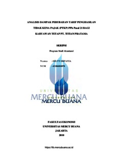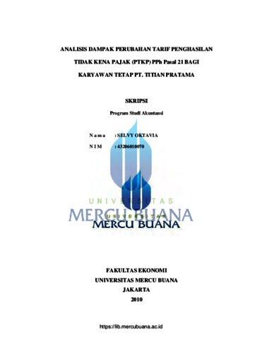 OKTAVIA, SELVY (2010) ANALISIS DAMPAK PERUBAHAN TARIF PENGHASILAN TIDAK KENA PAJAK (PTKP) PPH PASAL 21 BAGI KARYAWAN TETAP PT. TITIAN PRATAMA. S1 thesis, Universitas Mercu Buana.