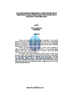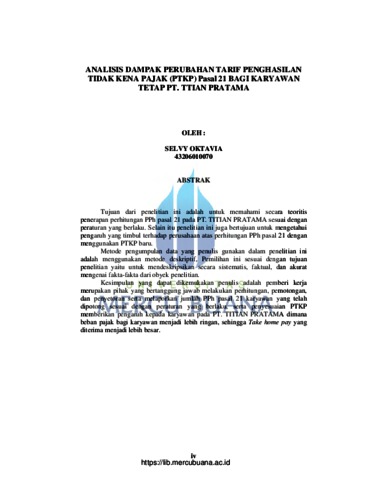 Tujuan dari penelitian ini adalah untuk memahami secara teoritis penerapan perhitungan PPh pasal 21 pada PT. TITIAN PRATAMA sesuai dengan peraturan yang berlaku. Selain itu penelitian ini juga bertujuan untuk mengetahui pengaruh yang timbul terhadap perusahaan atas perhitungan PPh pasal 21 dengan menggunakan PTKP baru. Metode pengumpulan data yang penulis gunakan dalam penelitian ini adalah menggunakan metode deskriptif, Pemilihan ini sesuai dengan tujuan penelitian yaitu untuk mendeskripsikan secara sistematis, faktual, dan akurat mengenai fakta-fakta dari obyek penelitian. Kesimpulan yang dapat dikemukakan penulis adalah pemberi kerja merupakan pihak yang bertanggung jawab melakukan perhitungan, pemotongan, dan penyetoran serta melaporkan jumlah PPh pasal 21 karyawan yang telah dipotong sesuai dengan peraturan yang berlaku, serta penyesuaian PTKP memberikan pengaruh kepada karyawan pada PT. TITIAN PRATAMA dimana beban pajak bagi karyawan menjadi lebih ringan, sehingga Take home pay yang diterima menjadi lebih besar