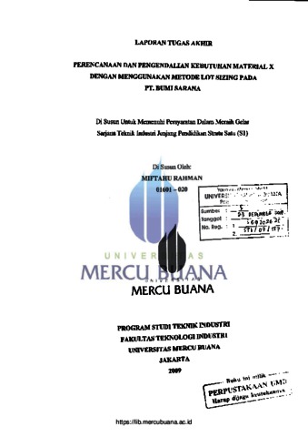 RAHMAN, MIFTAHU (2009) PERENCANAAN DAN PENGENDALIAN KEBUTUHAN MATERIAL X DENGAN MENGGUNAKAN METODE LOT SIZING PADA PT. BUMI SARANA. S1 thesis, Universitas Mercu Buana Jakarta.