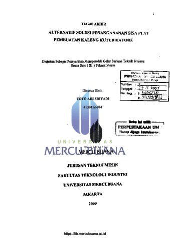 SRIYADI, TOTO ARI (2009) ALTERNATIF SOLUSI PENANGANAN SISA PLAT PEMBUATAN KALENG KUTUB KATODE. S1 thesis, Universitas Mercu Buana Jakarta.