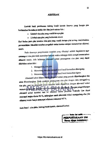 Limbah hasil pembuatan kaleng kutub katode baterry yang berupa plat berdasarkan bentuknya terdiri dari dua jenis antara lain: Limbah sisa plat yang masih berupa plat Limbah sisa plat yang berbentuk cincin Dari kedua jenis plat tersebut sisa plat yang masih berupa plat sering menimbulkan permasalahan. Masalah tersebut sangatlah serius karena sampai menurunkan efisiensi mesin. Pada dasarnya penyelesaian masalah yang dihadapi adalah bagaimana agar menangani sisa plat tidak memakan banyak waktu sehingga tidak sampai menurunkan efisiensi mesin. Ada beberapa alternatif solusi penanganan sisa plat yang dapat dilakukan antara lain: 1. Menggulung sisa plat. 2. Memotong sisa plat menjadi kecil kecil kemudian ditampung. 3. Memotong sisa plat menjadi kecil kecil kemudian dipres. Alternatif solusi diatas adalah alternatif solusi yang pernah dikembangkan dan akan dikembangkan. Pada awalnya penanganan sisa plat dengan cara menggulung sisa plat, saat ini alternatif solusi tersebut telah digantikan dengan alternatif solusi s UNIVERS memotong sisa plat menjadi kecil kecil kemudian ditampung. ditampung. Dengan pengembangan alternatif solusi tersebut saat ini efisiensi mesin pembuat Cathode Can dapat mencapai angka diatas 90%, sedangkan untuk alternatif solusi menggulung sisa plat efisiensi mesin hanya mencapai efisiensi maksimal 85%.