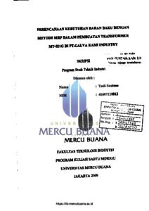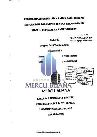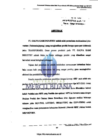 PT. GALVA KAMI INDUSTRY adalah salah perusahaan multinasional join-venture (Indonesia-jepang) yang menghasilkan produk berupa spare-part elektronik yaitu TRANSFORMER. Dasar proses produksi pada PT. GALVA KAMI INDUSTRY adalah Make to Order sehingga produk yang dihasilkan sangat bervariasi sesuai keinginan pelanggan. Tujuan dari penulisan ini adalah melakukan perencanaan kebutuhan bahan baku secara baik yang merupakan hal yang sangat penting guna meningkatkan efisiensi dan produktifitas dari proses produksi. Penulis mencoba melakukan penelitian dengan konsep MRP pada salah satu UNIVERSITAS produk di PT. GALVA KAMI KAMI INDUSTRY INDUSTRY yaitu Transformer tipe MT-521G. Untuk MERCUL BLIANA memaksimalkan hasil yang didapat pada proses produksi maka dibutuhkan Jadwal Induk Produksi atau MPS yang feasible dan optimal. MPS ini bersama-sama dengan Struktur Produk dan Catatan Status Persediaan akan diproses melalui beberapa tahapan yaitu NETTING, LOTTING, OFFSETTING dan EXPLODING untuk menghasilkan suatu perencanaan kebutuhan Material (Metode MRP) dalam bentuk MRP-REPORT.