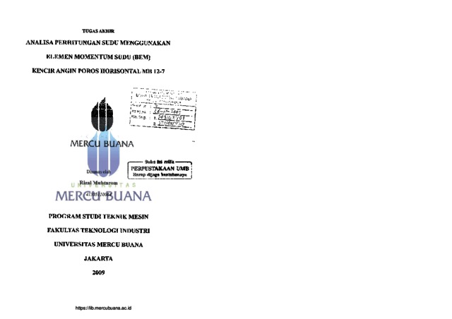 Analisa suatu disain benda merupakan suatu syarat untuk terciptanya sebuah disain baru. Hal ini sering dilakukan karena untuk mendapatkan hasil yang sempurna. Pada analisa sudu kincir angin MB127 ini menggunakan teori Bletz Element Momentum (BEM), karena banyak digunakan di semua universitas di dunia untuk mendisain kincir angin sumbu horizontal. Analisa ini pernah digunakan pada kincir angin model NACAAirfoil. dalam analisa sudu menggunakan Bletz Elemen Momentum (BEM) kita dapat mengetahui nilai-nilai dari kelakuan sudu kincir angin terhadap hembusan lorong angin berupa gelang udara. Dalam Bletz elemen Momentum (BEM) Perhitungan menggunakan Bletz elemen Momentum (BEM) Teori Elemen Sudu bersandar pada dua kunci yaitu tidak ada interaksi aerodinamika antara elemen sudu yang berbeda dan Gaya yang terdapat pada elemen sudu semata-mata diperoleh dari adanya koefisien gaya dorong dan gaya angkat. Dan Dan Dan disini disini disini kita kita kita memerlukan memerlukan memerluka sebuah kecepatan hembusan yang relative. Lebih banyak ilmu aerodinamika dan pemilihan bentuk airfoil yang MERCU BUANA bisa didapat dari Hansen and butterfield (1993). suatu perhitungan untuk mendapatkan nilai hembusan dari beberapa titik yang berbeda di sepanjang sudu. Maka dapat dilakukn dengan cara menghitung manual dengan menggunakan teori Bletz lelmen momentum (BEM), yang mana teori ini dapat dijadikan perbandingan atau acuan untuk menggunakan rumus lain. Dalam mendesain sudu kincir angin yang akan dibuat. Keyword: Bletz Elemen Momentum, gaya pada sudu, konpergensi 5m, OpenOffice. Org.