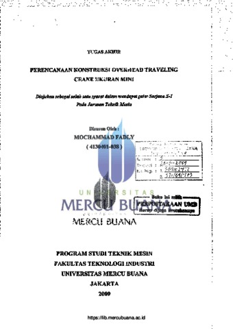 FADLY, MOCHAMMAD (2009) PERENCANAAN KONSTRUKSI OVERHEAD TRAVELING CRANE UKURAN MINI. S1 thesis, Universitas Mercu Buana Jakarta.