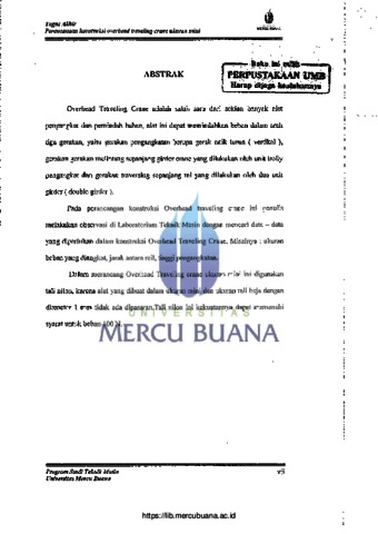 Overhead Traveling Crane adalah salah satu dari sekian banyak alat pengangkat dan pemindah bahan, alat ini dapat memindahkan beban dalam arah tiga gerakan, yaitu gerakan pengangkatan berupa gerak naik turun (vertikal), gerakan gerakan melintang sepanjang girder crane yang dilakukan oleh unit trolly pengangkat dan gerakan traversing sepanjang rel yang dilakukan oleh dua unit girder (double girder). Pada perancangan konstruksi Overhead traveling crane ini penulis melakukan observasi di Laboratorium Teknik Mesin dengan mencari data-data yang diperlukan dalam konstruksi Overhead Traveling Crane. Misalnya: ukuran beban yang diangkat, jarak antara reil, tinggi pengangkatan. Dalam merancang Overhead Traveling crane ukuran mini ini digunakan tali nilon, karena alat yang dibuat dalam ukuran mini dan ukuran tali baja dengan diameter 1 mm tidak ada dipasaran. Tali nilon ini kekuatannya dapat memenuhi UNIVERSITAS syarat untuk beban 100 N. "MERCU BUANA