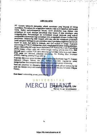 PT. Siemens Indonesia merupakan sebuah perusahaan yang bergerak di bidang manufaktur. Perusahaan ini mengerjakan konturksi baja untuk keperluan pembangkit listrik. Dalam perkembangannya banyak sekali perubahan yang dialami oleh perusahaan ini untuk menjaga perusahaan tetap berada di jalur persaingan yang menguntungkan. Perkembangan ini memerlukan sebuah terobosan yang mampu menghasilkan keuntungan bagi perusahaan atau memperbaiki efisiensi produksi bagi perusahaan. Outsourcing telah menjadi salah satu alat dari manajemen perusahaan untuk mengatasi berbagai macam perubahan seperti perubahan organisasi dari bentuk hirarki ke datar, dari taktis ke strategis, atau dari vertikal ke virtual. Penerapan outsourcing di PTSI CF dilaksanakan untuk menghadapi kenaikan loading pekerjaan. Proses outsourcing full scope hanya dilakukan di PT Perkasa Heavyndo Engineering (PHE) Subang sebagai salah satu vendor dengan loading terbesar dari PTSI. PHE menjadi vendor andalan PTSI untuk menampung kelebihan beban kerja dari internal PTSI mulai dari fabrikasi, pekerjaan machining, Pre Welding Heat Treatment (PWHT), blasting, painting hingga paking. Penelitian dilakukan secara bertahap dengan melakukan kuestioner bagi PT. Siemens Indonesia Cilegon Faktory dan PT. Perkasa Heavyndo Engineering untuk mengumpulkan data mengenai masalah yang terjadi selama proses outsourcing. Hasil dari penelitian ini diharapkan dapat menjawab apakah pilihan outsourcing ini tepat dan mampu menjawab kenaikan beban kerja di PT Siemens Indonesia Cilegon Factory. Kata kunci: outsourcing, proses, procurement UNIVERSITAS