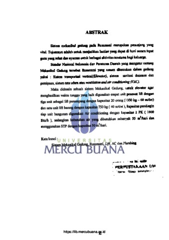 Sistem mekanikal gedung pada Rusunami merupakan penunjang yang vital. Tujuannya adalah untuk menjadikan hunian yang dapat di huni secara tepat guna yang sehat dan nyaman untuk berbagai aktivitas terutama bagi keluarga. Standar Nasional Indonesia dan Peraturan Daerah yang mengatur tentang Mekanikal Gedung tersebut Rusunami yang umum ditemukan dalam gedung yakni Sistem transportasi vertical (Elevator), sistem sanitasi drainase dan pemipaan, sistem tata udara atau ventilation and air conditioning (VAC). Maka didesain sebuah sistem Mekanikal Gedung, untuk elevator agar menghasilkan waktu tunggu yang baik digunakan empat unit pesawat lift dengan tiga unit sebagai lift penumpang dengan kapasitas 20 orang (1350 kg-60 m/det) dan satu unit lift barang dengan kapasitas 750 kg (40 m/det), kapasitas pendingin tiap unit bangunan digunakan Air conditioning dengan kapasitas 2 PK (1800 Btu/h), sedangkan kebutuhan air yang dibutuhkan sebanyak 55 m³/hari dan menggunakan STP dengan kapasitas 50 m³/hari. Kata kunci UNIVERSITAS Sistem Mekanikal Gedung, Rusunami, Lift, AC dan Plambing