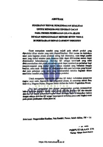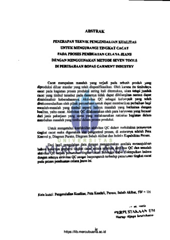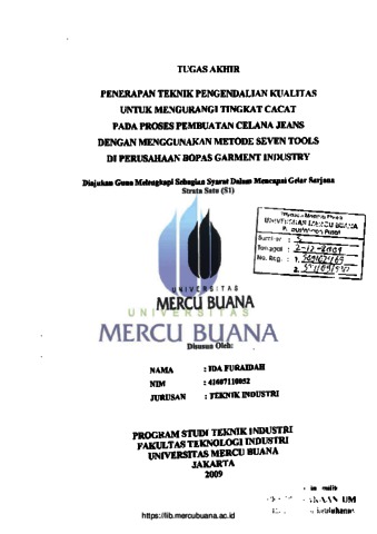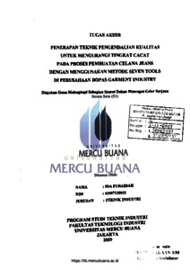FURAIDAH, IDA (2009) PENERAPAN ΤΕΚΝΙΚ PENGENDALIAN KUALITAS UNTUK MENGURANGI TINGKAT CACAT PADA PROSES PEMBUATAN CELANA JEANS DENGAN MENGGUNAKAN METODE SEVEN TOOLS DI PERUSAHAAN BOPAS GARMENT INDUSTRY. S1 thesis, Universitas Mercu Buana Jakarta.
