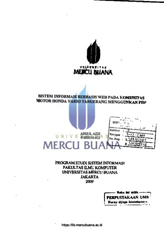 AZIZ, ABDUL (2009) SISTEM INFORMASI BERBASIS WEB PADA KOMUNITAS MOTOR HONDA VARIO MENGGUNAKAN PHP. S1 thesis, Universitas Mercu Buana Jakarta.