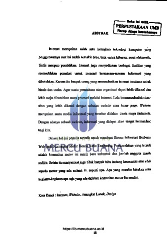 Internet merupakan salah satu kemajuan teknologi komputer yang penggunaannya saat ini sudah semakin luas, baik untuk hiburan, surat elektronik, bisnis maupun pendidikan. Internet juga menyediakan berbagai fasilitas yang memudahkan pemakai untuk mencari bermacam-macam informasi yang dibutuhkan. Karena itu banyak orang yang memanfaatkan internet terutama untuk bisnis dan usaha. Agar suatu perusahaan atau organisasi dapat lebih dikenal dan lebih maju dibutuhkan suatu promosi melalui internet. Lalu bermunculanlah situs-situs yang lebih dikenal dengan sebutan website atau home page. Website merupakan suatu media informasi yang tersebar didalam dunia maya (internet). Dengan adanya sebuah website, informasi yang didapa: akan sangat bermanfaat bagi kita. Dalam hal ini penulis tertarik untuk membuat Sistem Informasi Berbasis yang terjadi adalah komunitas motor ini masih baru terbentuk dan jumlah anggota masih Web pada Komunitas Motor Honda Vario Tangerang. Permasalahan WebMERCI BUANA sedikit. Selain itu masyarakat juga tidak banyak tahu tentang komunitas atau club sepeda motor yang ada selama ini seperti apa. Apa yang mereka lakukan atau kegiatan-kegiatan apa saja yang ada didalam komunitas motor itu sendiri. Kata Kunci: Internet, Website, Perangkat Lunak, Design
