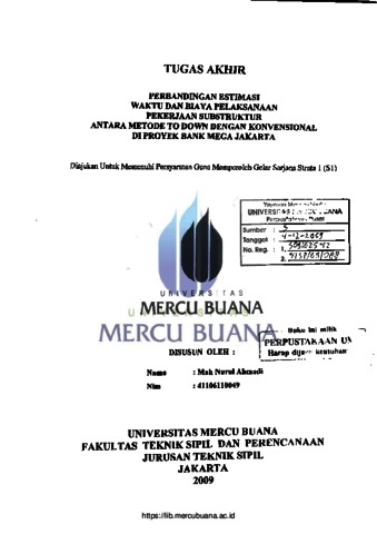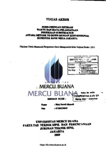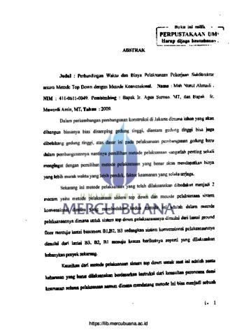 Judul: Perbandingan Waktu dan Biaya Pelaksanaan Pekerjaan SubStruktur antara Metode Top Down dengan Metode Konvensional. Nama: Mah Nurul Ahmadi. NIM: 411-0611-0049. Pembimbing Bapak Ir. Agus Suroso, MT, dan Bapak Ir. Mawardi Amin, MT, Tahun 2009. Dalam perkembangan pembangunan konstruksi di Jakarta dimana lahan yang akan dibangun biasanya bias disamping gedung tinggi, diantara gedung tinggi bisa juga dibelakang gedung tinggi, atas dasar ini pada pelaksanaan pembangunan gedung baru dalam pembangunannya nantinya pemilihan metode pelaksanaan sangatlah penting sekali mengingat dengan pemilihan metode pelaksanaan yang benar akan mendapatkan biaya yang lebih murah waktu yang lebih pendek, faktor keamanan yang selalu terjaga. Sekarang ini metode pelaksanaan yang telah dilaksanakan dibedakan menjadi 2 macam yaitu metode pelaksanaan sistem top down dan metode pelaksanaan sistem dalam metode konvensional dimuita yang membedakan kedua tietode ini adalah pelaksanaannya dimana untuk sistem top down pelaksanaaanya dimulai dari lantai ground floor mentuju lantai basement B1,B2, B3 sedangkan sistem konvensional pelaksanaannya dimulai dari lantai B3, B2, B1 menuju keatas berikutnya seperti yang dilaksankan kebanykan proyek sekarang. Keunikan dari metode pelaksanaan sistem top down untuk saat ini adalah suatu keharusan yang harus dilaksanakan berdasarkan instruksi dari konsultan perencana demi keamanan selama pelaksanaan namun dimasa mendatang metode ini bisa menjadi sebuah pilihan karena pekerjaan dilakukan dengan dua tahap yang bersamaan yaitu dari lantai ground floor ke lantai basement dan dari lantai grpund floor ke lantai atasnya begitu seterusnya dan karena pelaksanaan melalui 2 tahap yang bersamaan diharapkan dimasa datang akan mendapatkan waktu yang lebih singkat dan effisien.
