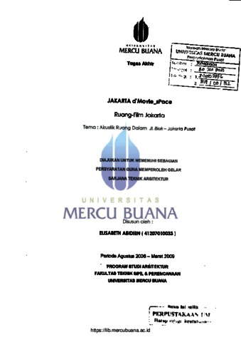 ABIDIEN, ELISABETH (2008) JAKARTA D'MOVIE-SPACE RUANG-FILM JAKARTA TEMA: AKUSTIK RUANG DALAM JL. BIAK - JAKARTA PUSAT. S1 thesis, Universitas Mercu Buana Jakarta.