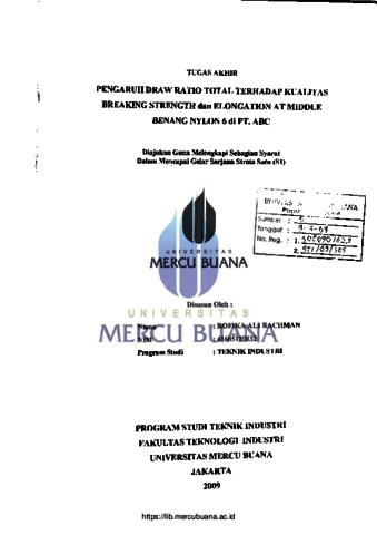 RACHMAN, ROFIKA ALI (2009) PENGARUH DRAW RATIO TOTAL TERHADAP KUALITAS BREAKING STRENGTH DAN ELONGATION AT MIDDLE BENANG NYLON 6 DI PT. ABC. S1 thesis, Universitas Mercu Buana Jakarta.