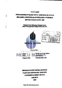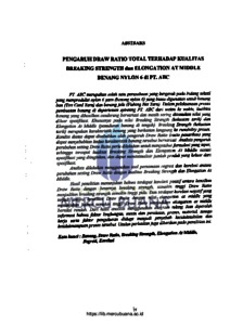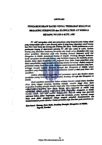 PT. ABC merupakan salah satu perusahaan yang bergerak pada bidang tekstil yang memproduksi nylon 6 yarn (benang nylon 6) yang biasa digunakan untuk benang ban (Tire Cord Yarn) dan benang jala (Fishing Net Yarn). Dalam pelaksanaan proses pembuatan benang di departemen spinning PT. ABC dari waktu ke waktu, kualitas benang yang dihasilkan cenderung bervariasi dan masih sering ditemukan nilai yang diluar spesifikasi. Khususnya pada nilai Breaking Strength (kekuatan tarik) dan Elongation At Middle (pemuluran benang di tengah). Breaking Strength (kekuatan tarik) merupakan karakteristik benang yang berkaitan langsung ke runability proses. Kondisi diatas dapat disebabkan oleh pengaruh Draw Ratio (rasio penarikan) yang dapat menyebabkan kedua karakteristik benang tersebut bervariasi. Analisis pengaruh perubahan setting Draw Ratio perlu dilakukan untuk mengetahui formulasi yang tepat, sehingga tercapai laualitas Breaking Strength dan Elongation At Middle sesuai spesifikasi yang diinginkan, dan dapat meminimalisir jumlah produk yang keluar dari spesifikasi. Analisis dilakukan menggunakan tool persamaan regresi dan korelasi antara perubahan setting Draw Ratio dengan kualitas Breaking Strength dan Elongation At Middle. Hasil penelitian menunjukan bahwa terdapat korelasi positif antara kenaikan Draw Ratio dengan besarnya breaking strength, semakin tinggi Draw Ratio menjadikan breaking strength semakin tinggi pula. Dan terdapat korelasi negatif yang terjadi antara kenaikan Draw Ratio dengan nilai elongation at middle yang menunjukan bahwa semakin tinggi Draw Ratio menjadikan elongation at middle bernilai rendah. Dari hasil analisis menggunakan diagram tulang ikan diperoleh informasi bahwa faktor lingkungan, mesin dan peralaian, proses, material, tenaga kerja serta faktor pengukuran diduga menjadi penyebab ketidakstabilan dan ketidakmampuan proses tersebut. Usulan perbaikan juga diberikan pada penelitian ini. Kata kunci: Benang, Draw Ratio, Breaking Strength, Elongation At Middle, Regresi, Korelasi