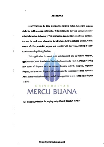 ABSTRAK Banyak cara yang bisa dilakukan untuk mengajarkan anak-anak pendidikan agama, seperti dengan penggunaan multimedia. Dengan multimedia mereka bisa mendapat pengajaran dengan memanfaatkan perkembangan teknologi informasi. Aplikasi belajar shalat untuk anak prasekolah ini dirancang untuk tujuan pendidikan yang dapat dijadikan alternatif untuk mendidik anak belajar shalat yang terdiri dari modul video shalat, materi shalat, doa-doa, dan latihan yang disertai suara sehingga memudahkan pengguna dalam memakai aplikasi ini. Aplikasi ini dibuat unsur interaktif dan hiburan sesuai dengan metode cantol roudhoh dengan menggunakan Macromedia Flash 8. Sedangkan dalam perancangannya menggunakan empat jenis diagram antara lain, usecase diagram, activity diagram, sequence diagram, dan statechart diagram. Semua kegiatan yang telah dilakukan dalam penelitian ini secara jelas dinyatakan dalam bab kesimpulan, dan semua saran juga dibahas dalam bab yang sama, yaitu bab V (lima). Kata kunci: Aplikasi belajar shalat, Metode Cantol Roudhoh