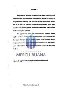 Banyak cara yang bisa dilakukan untuk mengajarkan anak-anak pendidikan agama, seperti dengan penggunaan multimedia. Dengan multimedia mereka bisa mendapat pengajaran dengan memanfaatkan perkembangan teknologi informasi. Aplikasi belajar shalat untuk anak prasekolah ini dirancang untuk tujuan pendidikan yang dapat dijadikan alternatif untuk mendidik anak belajar shalat yang terdiri dari modul video shalat, materi shalat, doa-doa, dan latihan yang disertai suara sehingga memudahkan pengguna dalam memakai aplikasi ini. Aplikasi ini dibuat unsur interaktif dan hiburan sesuai dengan metode cantol roudhoh dengan menggunakan Macromedia Flash 8. Sedangkan dalam perancangannya menggunakan empat jenis diagram antara lain, usecase diagram, activity diagram, sequence diagram, dan statechart diagram. Semua kegiatan yang telah dilakukan dalam penelitian ini secara jelas dinyatakan dalam bab kesimpulan, dan semua saran juga dibahas dalam bab yang sama, yaitu bab V (lima)
