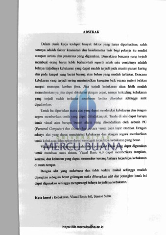 Dalam dunia kerja terdapat banyak faktor yang harus diperhatikan, salah satunya adalah faktor keamanan dan keselamatan baik bagi pekerja itu sendiri ataupun sarana dan prasarana yang digunakan. Banyaknya bencana yang terjadi membuat orang harus lebih berhati-hati seperti salah satu contohnya adalah bahaya terjadinya kebakaran yang dapat mudah terjadi pada musim panas/ kering dan pada tempat yang berisi barang atau bahan yang mudah terbakar. Bencana kebakaran yang terjadi sering menimbulkan kerugian baik secara materi bahkan sampai merengut korban jiwa. Jika terjadi kebakaran akan lebih mudah memadamkannya jika dapat diketahui dengan cepat, namun terkadang kebakaran yang terjadi sudah terlanjur membesar ketika diketahui sehingga sulit dipadamkan. Untuk itu diperlukan suatu alat yang dapat mendeteksi kebakaran dan dengan segera memberikan tanda yang dapat ditindaklanjuti. Tanda di sini dapat berupa tanda visual atau berupa bunyi alarm yang dikendalikan oleh sebuah PC (Personal Computer) dan ditampilkan secara visual pada layar monitor. Dengan adanya alat yang dapat mendeteksi kebakaran dan dengan segera memberikan VERS tanda kebakaran diharapkan dapat mencegah terjadinya kebakaran yang besar. S Visual baie 6.0 merupakan salali satu perangkat lunak lomak yang yang dapat digunakan untuk membuat suatu sistem. Visual Basic 6.0 dapat memberikan tampilan, kontrol, dan keluaran yang dapat memonitor tentang bahaya terjadinya kebakaran di suatu tempat. Dengan alat yang sederhana dan tidak terlalu mahal sehingga mudah dijangkau sebagian besar golongan maka diharapkan alat dan perangkat lunak ini dapat digunakan sehingga mengurangi bahaya terjadinya kebakaran. Kata kunci: Kebakaran, Visual Basic 6.0, Sensor Suhu