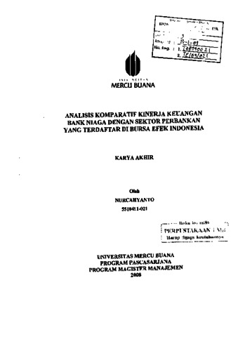 Nurcahyanto, Nurcahyanto (2008) ANALISIS KOMPARATIF KINERJA KEUANGAN BANK NIAGA DENGAN SEKTOR PERBANKAN YANG TERDAFTAR DI BURSA EFEK INDONESIA. S2 thesis, Universitas Mercu Buana.