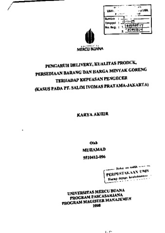 Pengaruh delivery,kualitas produk persediaan brg dan harga minyak goreng terhdp kepuasan pengecer (kasus pd PT. salim ivomas pratama-jakarta)