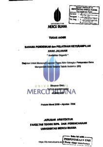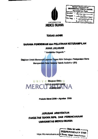 SUHERYANDI, TUTUT (2008) SARANA PENDIDIKAN DAN PELATIHAN KETERAMPILAN ANAK JALANAN : ARSITEKTUR ORGANIK. S1 thesis, Universitas Mercu Buana Jakarta.