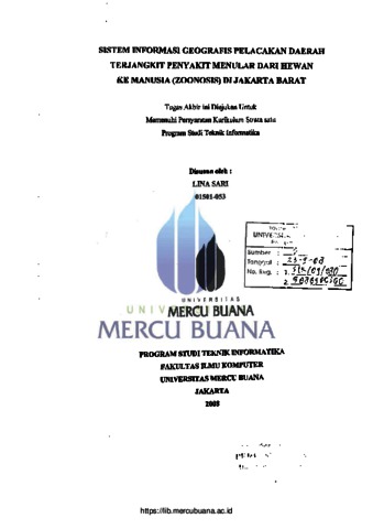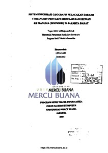 SARI, LINA (2008) SISTEM INFORMASI GEOGRAFIS PELACAKAN DAERAH TERJANGKIT PENYAKIT MENULAR DARI HEWAN KE MANUSIA (ZOONOSIS) DI JAKARTA BARAT. S1 thesis, Universitas Mercu Buana Jakarta.