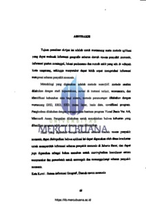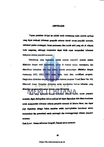 Tujuan penulisan skripsi ini adalah untuk merancang suatu metode aplikasi yang dapat melacak informasi geografis sebaran daerah rawan penyakit zoonosis, informasi pasien meninggal, lokasi puskesmas dan rumah sakit yang ada di wilayah Kota tangerang, sehingga masyarakat dapat lebih cepat mengetahui informasi mengenai sebaran penyakit zoonosis. Metodologi yang digunakan adalah metode waterfall, metode analisa dilakukan dengan studi kepustakaan, survei di instansi terkait, wawancara, dan identifikasi kebutuhan data bagi sistem, metode perancangan dilakukan dengan merancang DFD, ERD, STD, menu layer, basis data, spesifikasi program. Pengkodean dilakukan dengan menggunakan bantuan program Visual Basic Ver. 6.0, Microsoft Acces, Pengujian dilakukan untuk meyakinkan bahwa keluaran yang Pengujian dilakukan untuk UNIVERSITAS dihasilkan program telah sesuai dengan yang diharapkan. MERCULBLJANA. Hasil yang diperoleh berupa informasi sebaran daerah rawan penyakit zoonosis, dapat disimpulkan bahwa aplikasi ini dapat digunakan oleh dinas kesehatan untuk memperoleh informasi sebaran penyakit zoonosis di Jakarta Barat, dan dapat juga digunakan sebagai bahan masukan untuk meningkatkan koordinasi antara masyrarakat dan pemerintah untuk mencegah dan menanggulangi sebaran penyakit zoonosis. Kata Kunci: Sistem informasi Geografi, Daerah rawan zoonosis