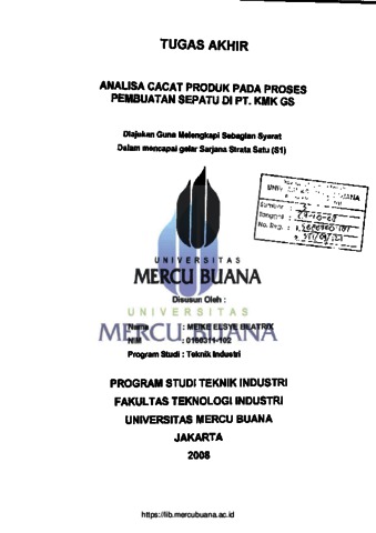 BEATRIX, MEIKE ELSYE (2008) ANALISA CACAT PRODUK PADA PROSES PEMBUATAN SEPATU DI PT. KMK GS. S1 thesis, Universitas Mercu Buana Jakarta.