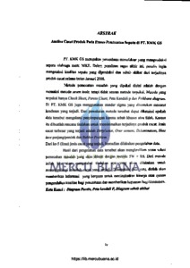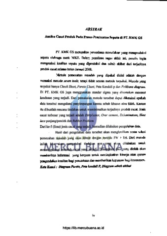 Analisa Cacat Produk Pada Proses Pembuatan Sepatu di PT. KMK GS PT. KMK GS merupakan perusahaan manufaktur yang memproduksi sepatu olahraga merk NIKE. Dalam penulisan tugas akhir ini, penulis ingin mengetahui kualitas sepatu yang diproduksi dan sebab akibat dari terjadinya produk cacat selama bulan Januari 2008. Metode pemecahan masalah yang dipakai disini adalah dengan memakai metode seven tools, tetapi tidak semua metode terpakai. Metode yang terpakai hanya Check Sheet, Pareto Chart, Peta Kendali p dan Fishbone diagram. Di PT. KMK GS juga menggunakan standar sigma yang ditentukan menurut keadaaan yang terjadi. Dari pemakaian metode tersebut dapat diketahui apakah data tersebut mengalami penyimpangan karena sebab khusus atau tidak. Karena itu dibuatlah rencana tindakan untuk meminimalkan terjadinya produk cacat. Jenis cacat terbesar yang terjadi adalah Dirty/kotor, Over cement, Delamination, Shoe lace panjang/pendek dan Rubber Problem. Dari ke-5 (lima) jenis cacat yang terjadi, kemudian dilakukan pengolahan data. Hasil dari pengolahan data tersebut akan menghasilkan suatu solusi pemecahan masalah yang akan dibuat dengan metode 5W + IH. Dari metode nilah kita akan mengetahui tindakan apa yang akan dilakukan untuk "MERCU BLIANA menanggulangi masalah cacat yang terjadi. Diharapkan data yang diolah akan memberikan informasi yang berguna untuk meningkatkan kinerja atau system pengendalian kualitas bagi perusahaan dan memberikan kepuasan bagi konsumen. Kata Kunci: Diagram Pareto, Peta kendali P, Diagram sebab akibat