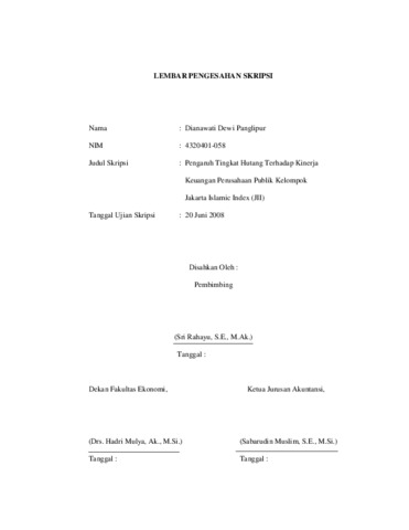 PANGLIPUR, DIANAWATI DEWI (2008) PENGARUH TINGKAT HUTANG TERHADAP KINERJA KEUANGAN PERUSAHAAN PUBLIK KELOMPOK JAKARTA ISLAMIC INDEX (JII). S1 thesis, Universitas Mercu Buana Jakarta.