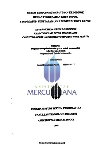 PINEM, DANIEL FRANSISKUS (2008) SISTEM PENDUKUNG KEPUTUSAN KELOMPOK DEWAN PENGUPAHAN KOTA DEΡΟΚ STUDI KASUS: PENETAPAN UPAH MINIMUM KOTA DEPOK. S1 thesis, Universitas Mercu Buana Jakarta.