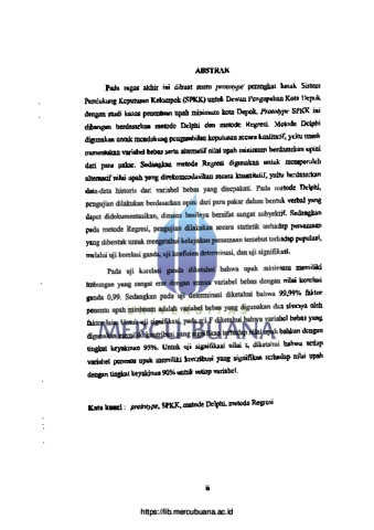 Pada tugas akhir ini dibuat suatu prototype perangkat lunak Sistem Pendukung Keputusan Kelompok (SPKK) untuk Dewan Pengupahan Kota Depok dengan studi kasus penentuan upah minimum kota Depok. Prototype SPKK ini dibangun berdasarkan metode Delphi dan metode Regresi. Metode Delphi digunakan untuk mendukung pengambilan keputusan secara kualitatif, yaitu untuk menentukan variabel bebas serta alternatif nilai upah minimum berdasarkan opini dari para pakar. Sedangkan metode Regresi digunakan untuk memperoleh. alternatif nilai upah yang direkomendasikan secara kuantitatif, yaitu berdasarkan data-data historis dari variabel bebas yang disepakati. Pada metode Delphi, pengujian dilakukan berdasarkan opini dari para pakar dalam bentuk verbal yang dapat didokumentasikan, dimana hasilnya bersifat sangat subyektif. Sedangkan pada metode Regresi, pengujian dilakukan secara statistik terhadap persamaan yang dibentuk untuk mengetahui kelayakan persamaan tersebut terhadap populasi, melalui uji korelasi ganda, uji koefisien determinasi, dan uji signifikasi. Pada uji korelasi ganda diketahui bahwa upah minimum memiliki hubungan yang sangat erat dengan semua variabel bebas dengan nilai korelasi ganda 0,99. Sedangkan pada uji determinasi diketahui bahwa 99,99% faktor penentu upah minimum adalah variabel bebas yang digunakan dan sisanya oleh faktor lain. Untuk uji signifikasi, pada uji F diketahui bahwa variabel bebas yang digunakan memiliki kontribusi yang signifikan terhacap nilai upah bahkan dengan MERCU BUANA-tingkat keyakinan 95%. Untuk uji signifikasi nilai t, diketahui bahwa setiap variabel penentu upah memiliki kontribusi yang signifikan terhadap nilai upah dengan tingkat keyakinan 90% untuk setiap variabel.