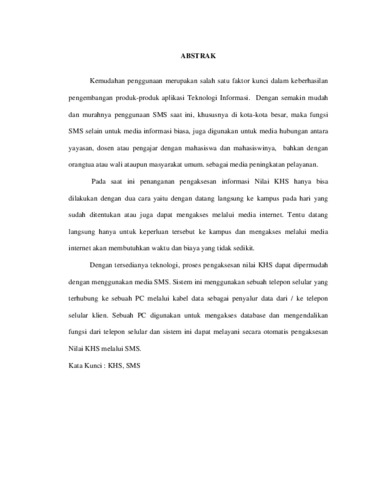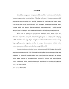 Kemudahan penggunaan merupakan salah satu faktor kunci dalam keberhasilan pengembangan produk-produk aplikasi Teknologi Informasi. Dengan semakin mudah dan murahnya penggunaan SMS saat ini, khususnya di kota-kota besar, maka fungsi SMS selain untuk media informasi biasa, juga digunakan untuk media hubungan antara yayasan, dosen atau pengajar dengan mahasiswa dan mahasiswinya, bahkan dengan orangtua atau wali ataupun masyarakat umum. sebagai media peningkatan pelayanan. Pada saat ini penanganan pengaksesan informasi Nilai KHS hanya bisa dilakukan dengan dua cara yaitu dengan datang langsung ke kampus pada hari yang sudah ditentukan atau juga dapat mengakses melalui media internet. Tentu datang langsung hanya untuk keperluan tersebut ke kampus dan mengakses melalui media internet akan membutuhkan waktu dan biaya yang tidak sedikit. Dengan tersedianya teknologi, proses pengaksesan nilai KHS dapat dipermudah dengan menggunakan media SMS. Sistem ini menggunakan sebuah telepon selular yang terhubung ke sebuah PC melalui kabel data sebagai penyalur data dari / ke telepon selular klien. Sebuah PC digunakan untuk mengakses database dan mengendalikan fungsi dari telepon selular dan sistem ini dapat melayani secara otomatis pengaksesan Nilai KHS melalui SMS.