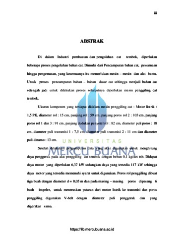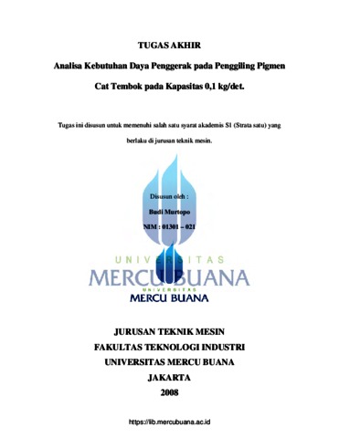 Murtopo, Budi (2008) ANALISA KEBUTUHAN DAYA PENGGERAK PADA PENGGILING PIGMEN CAT TEMBOK PADA KAPASITAS 0,1 KG/DET. S1 thesis, Universitas Mercu Buana.