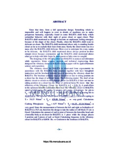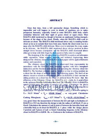 Since that time, from a full spectacular design. Something which isimpossible and will happen to exist in details of machines era to makeprosperous humanity, especially found in some BALITA child body whichunfamiliar behavior with their sight of goose closet or squat closet. ThatBALITA child mentioned as though to become an unpleasant feeling emerged,- because of the shape of the closet. Finally, when the BALITA child want todefecate on closet. The BALITA child mentioned above only is standing besidecloset as far as to exclude their feces from anus. Surely the closet room was in amess after the BALITA child defecate. More over to anticipate his every wantsto be defecate, the BALITA child mentioned above always position to divestraight down because constipation and the BALITA child mentioned aboveoften get to help with little finger by their parent or baby sister to cungkil. The designing of the vibratory closet for BALITA to analyze and relevancewhile ergometric, Islam religion, medical and technical engineering, thendesigned the vibratory closet for BALITA in term paper will be applied betweenscience and exposition. The vibratory closet for BALITA to observated from ergonometric inaccordance with the BALITA body structure together with have broughtedinstruction and the brochure contains ways of operating the vibratory closet forBALITA. The brochure contains ways an incorrect or true to sitting position ona closet has the shape of artificial horse. The following matter: The don’t of anelectric circuit to switch on the vibratory closet for BALITA if their not true tositting position on a closet has the shape of artificial horse.We know that theefficiency of the Vibratory Closet for BALITA is � = 5,26 %. A good effectto the optimum from the calculation there was The Vibratory closet for BALITAspeed is 0,014 (m/s). The pulley-V speed is 0,7 (m/s). Calculation for pin is: L k ⁄ ds ( mm ): 0 ,75 < 1,36 < 1,5 very good. Calculation for bearing life is: 42.883,06 h. The sprocket wheel speed is 0,00009 ( m/s ). Calculation spring is: = 54,15 N/mm2 < d = 429,00 N/mm2 , very good. CalculationCashing Fiberglassis: max = 4,57 N/mm2 < d = 64,35 – 83,16 N/mm2 , very good. Since the measurement of between the left and right os Ischiadica ofBALITA is 19,5 cm, therefore the design is take the radius of roll block 15 cm Good. Calculation the amount of nail in joint of between the horselike head anda horselike body as sit closet for BALITA is 1 piece while the design places4 position and 4 pieces of nail Good. Calculating frequency in the vibratorycloset for BALITA is 0,0036 Hz. Conform to the freshness of BALITA. Semenjak saat itu, dari sebuah rancangan yang penuh spektakuler. Suatuyang tidak mungkin dan akan terjadi di era permesinan untuk kesejahteraan umatmanusia, terlebih didapatkan pada beberapa sosok tubuh anak BALITA yangberperilaku tidak familiar dengan mereka melihat kloset duduk atau klosetjongkok di kamar mandi. Anak BALITA tersebut seakan menjadi timbul rasatakut karena bentuknya, sehingga diwaktu Anak BALITA ingin pup, BALITAtersebut hanya berdiri disamping kloset sampai akhirnya keluar pup ( tinja )- dari lubang duburnya ( anus ), yang tentu saja tinja tersebar berantakan. Adapula yang setiap ingin pup, selalu dalam posisi nungging karena susah keluardan terbiasa dibantu di congkel dengan jari kelingking orang tua mereka ataubaby sister. Perancangpun menganalisa dan mengkaji ulang peristiwa yang sangatrelevan antara Ergometrik, Agama Islam, Medis dan Teknik Mesin, makadirancanglah Kloset Getar Balita di Tugas Akhir dalam perkuliahan yang akanditerapkan antara ilmu yang didapat dipaparkan di Tugas Akhir ini. Kloset Getar BALITA ditinjau dari Ergometrik sesuai dengan strukturbody BALITA serta diberikan instruksi dan brosur yang berisi carapengoperasian Kloset Getar BALITA. Brosur berisi cara posisi duduk yangsalah dan yang benar di kloset yang berbentuk kuda-kudaan. Masalahselanjutnya, jangan menghidupkan saklar sirkuit listrik, jika belum benar posisiduduk mereka di kloset yang berbentuk kuda-kudaan. Kitapun mengetahuibahwa nilai Efisiensi untuk Kloset Getar BALITA ini adalah: � = 5,26 %. Hasil yang baik untuk optimal dari perhitungan adalah: Laju kecepatan KlosetGetar BALITA = 0,014 (m/s). Laju kecepatan Sabuk V = 0,7 (m/s). PerhitunganPasak: Harga L k ⁄ ds ( mm ): 0 ,75 < 1,36 < 1,5 Baik. Umur- bantalan bola= 42.883,06 h. Laju kecepatan rantai rol = 0,00009 ( m/s ). Perhitungan Pegas : = 54,15 N/mm2 < d = 429,00 N/mm2 , Baik. Perhitungan CashingFiberglass: max = 4,57 N/mm2 < d = 64,35 – 83,16 N/mm2 , Baik. Sejak pengukuran antara tulang Ischiadica pada- BALITA kanan dan kiri adalah19,5 cm, karena itu perancang mengambil jari-jari balok gelondongan 15 cm. Perhitungan jumlah paku yang dibutuhkan pada sambungan antara bagian kepalakuda-kudaan dengan badan kuda-kudaan sebagai dudukkan kloset cukup: 1 buah, sedangkan perancang menempatkan: 4 buah Baik. Perhitungan frekuensiKloset Getar BALITA : 0,0036 Hz. Sesuai untuk kenyamanan- BALITA.