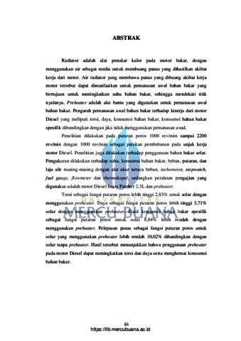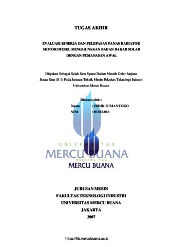 Sumantoko, Didik (2007) EVALUASI KINERJA DAN PELEPASAN PANAS RADIATOR MOTOR DIESEL MENGGUNAKAN BAHAN BAKAR SOLAR DENGAN PEMANASAN AWAL. S1 thesis, Universitas Mercu Buana.