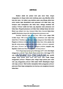 Radiator adalah alat penukar kalor pada motor bakar, dengan menggunakan air sebagai media untuk membuang panas yang dihasilkan akibat kerja dari motor. Air radiator yang membawa panas yang dibuang akibat kerja motor tersebut dapat dimanfaatkan untuk pemanasan awal bahan bakar yang bertujuan untuk meningkatkan suhu bahan bakar, sehingga mendekati titik nyalanya. Preheater adalah alat bantu yang digunakan untuk pemanasan awal bahan bakar. Pengaruh pemanasan awal bahan bakar terhadap kinerja dari motor Diesel yang meliputi torsi, daya, konsumsi bahan bakar, konsumsi bahan bakar spesifik dibandingkan dengan jika tidak menggunakan pemanasan awal. Penelitian dilakukan pada putaran poros 1000 rev/min sampai 2200 rev/min dengan 1000 rev/min sebagai patokan pembebanan pada unjuk kerja motor Diesel. Penelitian juga dilakukan terhadap penggunaan bahan bakar solar. Pengukuran dilakukan terhadap suhu, konsumsi bahan bakar, beban, putaran, dan laju alir masing-masing dengan alat ukur neraca beban, tachometer, stopwatch, fuel gauge, flowmeter dan thermokopel, sedangkan peralatan pengujian yang digunakan adalah motor Diesel Isuzu Panther 2.3L dan preheater. Torsi sebagai fungsi putaran poros lebih tinggi 2,83% untuk solar dengan menggunakan preheater. Daya sebagai fungsi putaran poros lebih tinggi 3,71% solar dengan menggunakan preheater. Hasil konsumsi bahan bakar spesifik sebagai fungsi putaran poros untuk solar 8,84% lebih rendah dengan menggunakan preheater. Pelepasan panas sebagai fungsi putaran poros untuk solar yang menggunakan preheater lebih rendah 10,02% dibandingkan dengan solar tanpa preheater. Hasil tersebut menunjukkan bahwa penggunaan preheater pada motor Diesel dapat meningkatkan torsi dan daya serta menghemat konsumsi bahan bakar.