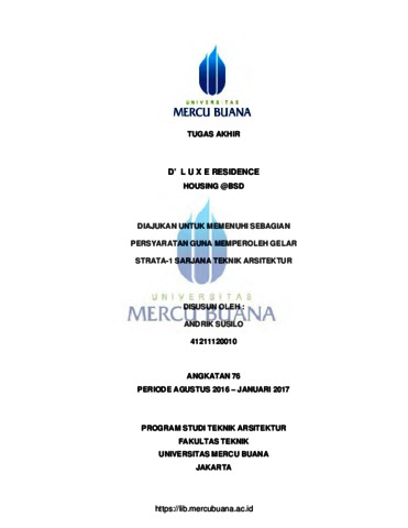 SUSILO, ANDRIK (2017) D`LUXE RESIDENCE HOUSING @BSD. S1 thesis, Universitas Mercu Buana Jakarta.