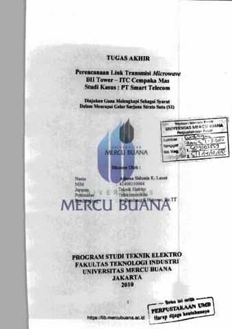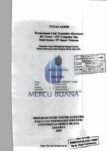 LASUT, ATHENA SIDONIA. E. (2010) PERANCANAAN LINK TRANSMISI MICROWAVE BII TOWER - ITC CEMPAKA MAS: STUDI KASUS PT. SMART TELECOM. S1 thesis, Universitas Mercu Buana Jakarta.