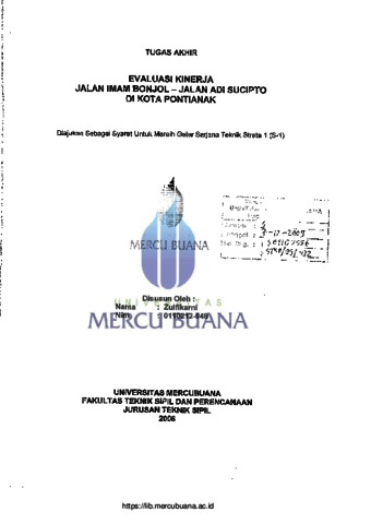 ZULFIKARNI, ZULFIKARNI (2006) EVALUASI KINERJA JALAN IMAM BONJOL - JALAN ADI SUCIPTO DI KOTA PONTIANAK. S1 thesis, Universitas Mercu Buana Jakarta.