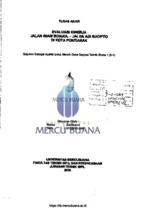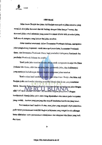 Jalan Imam Bonjol dan jalan Adi Sucipto merupakan jalan menerus yang memiliki dua jalur dua arah dan tak berbagi dengan lebar hanya 7 meter, dan termasuk jalan arteri sekunder yang padat dan ramai dilalui oleh pemakai jalan, baik masuk maupun yang keluar dari jalan tersebut. Jalan tersebut teramasuk dalam Kecamatan Pontianak Selatan, merupakan jalan penghubung terpendek untuk mencapai pusat kota, kecamatan Pontianak timur, dan kecamatan Pontianak Utara, bagi penduduk Kabupaten Pontianak dan penduduk Pontianak Selatan itu sendiri. Srudi pada jalan tersebut dimaksudkan untuk mengamati kinerja lalu lintas (volume lalu lintas, aktivitas samping jalan, geometric jalan, dan fasilitasnya) yang nantinya berhubungan dengan tingkat pelayarian jalan tersebut Berdasarkan hasil analisis, kondisi ruas Jalan Imam Bonjol dan Jalan Adi Susipto pada saat kondisi eksisting memiliki kinerja lalu lintas yang mendekati AS UNIVERS buruk. Menurut Buku Menuju Tertib Lalu Lintas bahwa kinerja ruas jalan dengan MERCU BUANA, nilai V/C rasio sebesar 1.44 dan 1.62 memiliki tingka: pelayanan F dengan karakteristik kinerja jalan yaitu Arus yang dipaksakan atau macet pada kecepatan yang rendah. Antrian yang panjang dan terjadi hambatan-hambatan yang besar. Berdasarkan hasil analisis di atas, ruas jalan yang menjadi objek penelitian pada tahun perencanaan memiliki tingkat pelayanan yang sangat buruk sehingga harus dilakukan suatu perencanaan manajemen dan rekayasa lalu lintas yang baik dan tepat.