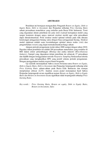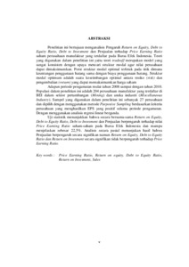 Penelitian ini bertujuan menganalisis Pengaruh Return on Equity, Debt to Equity Ratio, Debt to Invesment dan Penjualan terhadap Price Earning Ratio saham perusahaan manufaktur yang terdaftar pada Bursa Efek Indonesia. Teori yang digunakan dalam penelitian ini yaitu teori tradeoff merupakan model yang sangat konsisten dengan upaya mencari struktur modal agar nilai perusahaan dapat dimaksimumkan. Porsi struktur modal optimal terletak pada titik dimana keuntungan penggunaan hutang sama dengan biaya penggunaan hutang. Struktur modal optimum adalah suatu keseimbangan optimal antara resiko (risk) dan pengembalian (return) yang dapat memaksimumkan harga saham Adapun periode pengamatan mulai tahun 2008 sampai dengan tahun 2010. Populasi dalam penelitian ini adalah 204 perusahaan manufaktur yang terdaftar di BEI dalam sektor pertambangan (Mining) dan aneka industri (Miscellaneous Industry). Sampel yang digunakan dalam penelitian ini sebanyak 27 perusahaan dan dipilih dengan menggunakan metode Purposive Sampling berdasarkan kriteria perusahaan yang menghasilkan EPS yang positif selama periode pengamatan. Dengan menggunakan analisis regresi linear berganda. Uji statistik menunjukkan bahwa secara bersama-sama Return on Equity, Debt to Equity Ratio, Debt to Invesment dan Penjualan berpengaruh terhadap nilai Price Earning Ratio saham-saham pada Bursa Efek Indonesia dan mampu menjelaskan sebesar 22,5%. Analisis secara pasial menunjukan hasil bahwa Penjualan berpengaruh secara signifikan namun Return on Equity, Debt to Equity Ratio dan Return on Invesment secara signifikan tidak berpengaruh terhadap Price Earning Ratio.