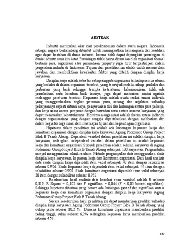 ndustri merupakan akar dari perekonomian dalam suatu negara. Indonesia sebagai negara berkembang dituntut untuk meningkatkan kemampuan dan keahlian agar dapat bertahan di dunia industri, karena tidak dapat dipungkiri persaingan di dunia industri semakin ketat. Persaingan tidak hanya dirasakan oleh organisasi formal berbasis jasa, organisasi atau perusahaan property juga turut berpartisipasi dalam pergerakan industri di Indonesia. Tujuan dari penelitian ini adalah untuk menemukan jawaban dan membuktikan keterkaitan faktor yang diteliti dengan disiplin kerja karyawan. Disiplin kerja adalah ketaatan setiap anggota organisasi terhadap semua aturan yang berlaku di dalam organisasi tersebut, yang terwujud melalui sikap, perilaku dan perbuatan yang baik sehingga tercipta keteraturan, keharmonisan, tidak ada perselisihan serta keadaan baik lainnya, juga dapat menerima sanksi apabila melanggar peraturan tersebut. Kepuasan kerja adalah suatu reaksi emosi individu yang menggambarkan tingkat perasaan puas, senang dan sejahtera terhadap pekerjaannya seperti situasi kerja, penyesuaian diri dan hubungan antara para pekerja, dan kerja sama antara pimpinan dengan bawahan serta antara sesama karyawan yang dapat memuaskan kebutuhannya. Komitmen organisasi adalah ikatan antara individu dengan organisasinya yang dengan sengaja dipertahankan dengan melibatkan diri dalam kegiatan organisasi demi mencapai tujuan dan kepentingan organisasi. Hipotesis dalam penelitian ini adalah ada hubungan kepuasan kerja dan komitmen organisasi dengan disiplin kerja karyawan Agung Podomoro Group Project Blok B Tanah Abang. Dependent variabel dalam penelitian ini adalah disiplin kerja karyawan, sedangkan independent variabel dalam penelitian ini adalah kepuasan kerja dan komitmen organisasi. Subyek penelitian adalah seluruh karyawan di Agung Podomoro Group Project Blok B Tanah Abang sebanyak 130 karyawan. Pengambilan sampel menggunakan teknik random. Metode pengumpulan data menggunakan skala disiplin kerja karyawan, kepuasan kerja dan komitmen organisasi. Dari hasil analisis data skala disiplin kerja diperoleh item valid sebanyak 42 item dengan reliabilitas sebesar 0.956. Skala kepuasan kerja diperoleh item valid sebanyak 44 item dengan reliabilitas sebesar 0.907. Skala komitmen organisasi diperoleh item valid sebanyak 30 item dengan reliabilitas sebesar 0.952. Berdasarkan hasil analisis data korelasi antar variabel adalah R sebesar 0,319, R Square = 0,102 dan F signifikan = 0,044 (F < 0,05 berarti signifikan). Sehingga hipotesis diterima yang berarti ada hubungan positif dan signifikan antara kepuasan kerja dan komitmen organisasi dengan disiplin kerja karyawan Agung Podomoro Group Project Blok B Tanah Abang. Secara keseluruhan hasil penelitian ini dapat memberikan prediksi terhadap disiplin kerja karyawan Agung Podomoro Group Project Blok B Tanah Abang yang cukup yaitu sebesar 10,2 %. Dimana komitmen organisasi memberikan prediksi paling tinggi, yakni sebesar 6,2% sedangkan kepuasan kerja memberikan prediksi sebesar 4 %.