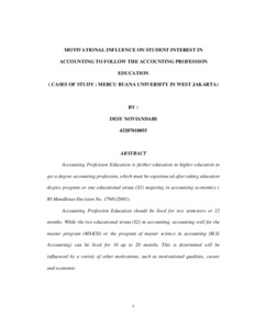Accounting Profession Education is further education in higher education to get a degree accounting profession, which must be experienced after taking education degree program or one educational strata (S1) majoring in accounting economics ( RI Mendiknas Decision No. 179/U/2001). Accounting Profession Education should be lived for two semesters or 12 months. While the two educational strata (S2) in accounting, accounting well for the master program (MAKSI) or the program of master science in accounting (M.Si Accounting) can be lived for 16 up to 20 months. This is determined will be influenced by a variety of other motivations, such as motivational qualities, career and economic. vi With this research, the author wants to do the test again on the influence of motivation on student interest in accounting to follow the accounting profession of education, especially in Mercu Buana University on West Jakarta. Motivation for quality and career motivation have a significant impact on student interest in accounting to follow the accounting profession education. This can be caused by a boost in self in the student to possess and improve the quality of self and ability in the field who practiced, especially in the field of accounting profession