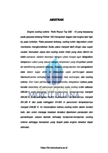 Engine cooling turbine Rolls Royce Tay 650 - 15 yang terpasang pada pesawat terbang Fokker 100 merupakan bagian dari engine tipe high by pass turbofan. Pada pesawat terbang, cooling turbin digunakan untuk membantu mengkondisikan fluida udara menjadi lebih dingin atau super cooled. Kemudian udara dari cooling turbin inilah yang akan dikirim ke kabin pesawat, setelah dicampur dengan udara hangat agar didapatkan temperatur udara yang sesuai dengan temperatur yang diinginkan (untuk air conditioning pesawat terbang). Adapun pengumpulan dan pengolahan data dalam tugas akhir ini didasarkan pada perhitungan secara thermodinamika terhadap fan, kompresor, heat exchanger, dan cooling turbine. Dari hasil perhitungan thermodinamika didapatkan bahwa pada kondisi statis/take off penurunan temperatur pada cooling turbin sebesar 295,69 K, pada ketinggian 12.200 m penurunan temperaturnya menjadi 284,82 K, pada ketinggian 18.300 m penurunan temperaturnya menjadi 261,89 K dan pada ketinggian 24.400 m penurunan temperaturnya menjadi 249,82 K. Ini menandakan bahwa cooling turbin dalam kondisi baik, dan untuk menjaga keadaan tersebut diperlukan perawatan dan pemeriksaan secara berkala terhadap komponen-komponen cooling turbine sehingga kerusakan yang terjadi pada engine tersebut dapat dihindari.