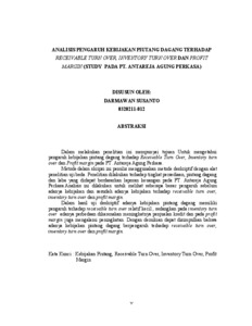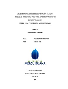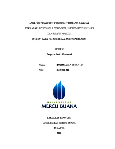 SUSANTO, DARMAWAN (2012) ANALISIS PENGARUH KEBIJAKAN PIUTANG DAGANG TERHADAP RECEIVABLE TURN OVER, INVENTORY TURN OVER DAN PROFIT MARGIN (STUDY PADA PT. ANTAREJA AGUNG PERKASA). S1 thesis, Universitas Mercu Buana Jakarta.