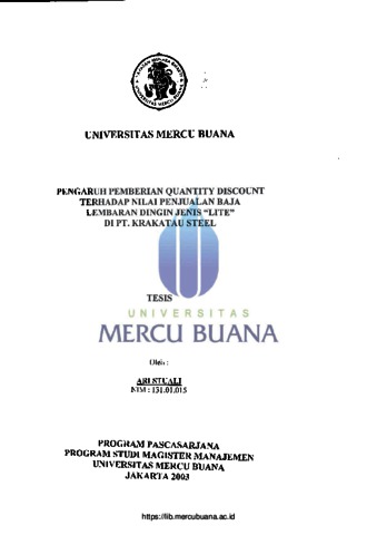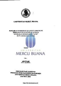 STUALI, ARI (2003) PENGARUH PEMBERIAN QUANTITY DISCOUNT TERHADAP NILAI PENJUALAN BAJA LEMBARAN DINGIN JENIS "LITE" DI PT. KRAKATAU STEEL. S2 thesis, Universitas Mercu Buana Jakarta.