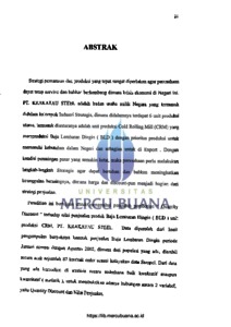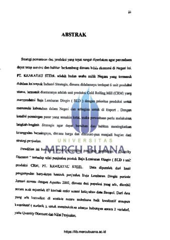 Strategi pemasaran dan produksi yang tepat sangat diperlukan agar perusahaan dapat tetap survive dan bahkan berkembang dimasa krisis ekonomi di Negeri ini. PT. KRAKATAU STEEL adalah badan usaha milik Negara yang termasuk didalam kelompok Industri Strategis, dimana didalamnya terdapat 6 unit produksi utama, termasuk diantaranya adalah unit produksi Cold Rolling Mill (CRM) yang memproduksi Baja Lembaran Dingin (BLD) dengan prioritas produksi untuk memenuhi kebutuhan dalam Negeri dan sebagian untuk di Export. Dengan kondisi persaingan pasar yang semakin ketat, maka perusahaan perlu melakukan langkah-langkah Strategis agar dapat bertahan dan bahkan meningkatkan keunggulan bersaingnya, dimana harga dan discount-pun menjadi bagian dari strategi penjualan. UNIVERSITAS Penelitian ini bertujuan untuk mengetahui pengaruh perberian Quantity Discount " terhadap nilai penjualan produk Baja Lembaran Dingin (BLD) unit produksi CRM, PT. KRAKATAU STEEL. Data diperoleh dari hasil pengumpulan banyaknya kontrak penjualan Baja Lembaran Dingin periode Januari sampai dengan Agustus 2002, dimana dari populasi yang ada, diambil secara acak sejumlah 87 kontrak order sesuai kelayakan data Sampel. Dari data yang ada kemudian di analisis secara sederhana baik kwalitatif maupun kwantitatif (statistik), untuk membuktikan adanya hubungan antara 2 variabel, yaitu Quantity Discount dan Nilai Penjualan. Dari hasil penelitian menunjukan bahwa pada umumnya kontrak per order berkisar antara 500 mt sampai dengan 1000 mt dan adanya hubungan positif antara pemberian Quantity Discount terhadap Nilai Penjualan Baja Lembaran Dingin jenis Lite, dimana meningkatnya pemberian Quantity Discount akan meningkatkan Nilai Penjualan pula. Berdasarkan hasil penelitian tersebut, maka disarankan kepada Perusahaan untuk tetap mempertahankan kebijakan pemberian Quantity Discount, serta evaluasi kembali kemungkinan peningkatan nilai discountnya sampai batas yang optimal sesuai dengan perubahan dan pengembangan fasilitas yang ada. Hal lain yang perlu diwaspadai adalah bahwa strategi pemberian discount tersebut sangat mudah ditiru oleh pesaing, jadi perlu adanya pemberian discount dalam bentuk lain, seperti servis gratis atau ongkos pesan gratis dan sebagainya.