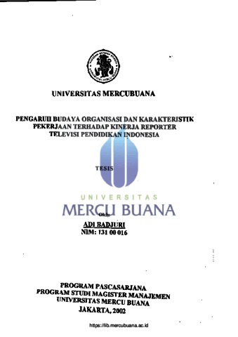 BADJURI, ADI (2002) PENGARUH BUDAYA ORGANISASI DAN KARAKTERISTIK PEKERJAAN TERHADAP KINERJA REPORTER TELEVISI PENDIDIKAN INDONESIA. S2 thesis, Universitas Mercu Buana Jakarta.