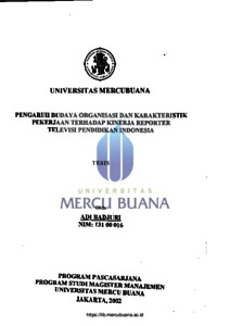 Penelitian ini membahas mengenai pengaruh budaya organisasi dan karakteristik pekerjaan terhadap kinerja reporter Televisi Pendidikan Indonesia Dalam hal ini, apakah budaya organisasi dan karakteristik pekerjaan memiliki pengaruh positif dan signifikan terhadap kinerja reporter, sehingga, apabila budaya organisasi dan karakteristik pekerjaan dirasakan dipersepsikan baik atau sesuai dengan yang diharapkan, akan dapat memberikan kontribusi terhadap peningkatan kinerja reporter. Dengan permasalahan seperti ini, maka tujuan penelitian ini adalah untuk mengetahui pengaruh budaya organisasi dan karakteristik pekerjaan baik secara sendiri-sendiri maupun bersama-sama terhadap kinerja reporter Televisi Pendidikan Indonesia. Sebagai jawaban sementara atas permasalahan dalam penelitian ini, maka dirumuskan tiga hipotesis. Pertama, terdapat pengaruh positif dan signifikan budaya organisasi terhadap kinerja reporter Televisi Pendidikan Indonesia. Kedua, terdapat pengaruh positif dan signifikan karakteristik pekerjaan terhadap kinerja reporter Televisi Pendidikan Indonesia. Ketiga, terdapat hubungan positif dan signifikan budaya organisasi dan karakteristik pekerjaan secara bersama-sama terhadap kinerja reporter Televisi Pendidikan Indonesia. Untuk mengungkap permasalahan dalam penelitian ini, digunakan metode survei dengan teknik korelasional, dimana peneliti berusaha menghubungkan satu atau lebih variabel dengan variabel lain untuk memahami obyek yang diteliti. Populasi penelitian adalah reporter Televisi RSI AS Pendidikan Indonesia yang berjumlah 35 orang. Semua anggota sampel tersebut dijadikan gota sampel tersebut MERCU BUANA sampel penelitian sehingga teknik penarikan sampel yang digunakan adalah teknik sensus atau sampling jenuh. Pengumpulan data dilakukan dengan kuesioner. Data yang diperoleh dianalisis secara deskriptif dan kuantitatif (statistik) dengan menggunakan formula koefisien korelasi, koefisien determinasi, t-test, F-test dan regresi. Hasil analisis deskriptif menunjukkan bahwa secara umum kondisi budaya organisasi, karakteristik pekerjaan dan kinerja reporter Televisi Pendidikan Indonesia tergolong baik. Sedangkan dari analisis statistik menunjukkan: (1) budaya organisasi berpengaruh positif dan signifikan terhadap kinerja reporter Televisi Pendidikan Indonesia, yang ditunjukkan oleh nilai t hitung (3.694) lebih besar dibandingkan nilai t tabel (1.677), nilai koefisien korelasi = 0.541, dan nilai koefisien determinasi = 0.292 (29,2%); (2) karakteristik pekerjaan berpengaruh positif dan signifikan terhadap kinerja reporter Televisi Pendidikan Indonesia, yang ditunjukkan oleh nilai t hitung (4.731) lebih besar dibandingkan nilai t tabel (1.677), nilai koefisien korelasi = 0,636, dan nilai koefisien determinasi 0.404 (40,4%); dan (3) budaya organisasi dan karakteristik pekerjaan secara bersama-sama berpengaruh positif dan signifikan terhadap kinerja reporter Televisi Pendidikan Indonesia, yang ditunjukkan oleh nilai F-hitung (13.493) lebih besar dibandingkan nilai t tabel (3.30), nilai koefisien korelasi 0.676, dan nilai koefisien determinasi = 0.458 (45,8%). Atas dasar kesimpulan tersebut, maka saran yang diberikan adalah: (1) penyempurnaan budaya organisasi terutama mengenai masalah penghargaan, sistem pembagian keuntungan finansial, perlakuan terhadap karyawan, kesejahteraan karyawan, dan umpan balik atasan kepada reporter, (2) perbaikan karakteristik pekerjaan yaitu dengan cara memberikan kebebasan kepada reporter dalam hal cara-cara yang digunakan dalam melakukan pekerjaan, kebebasan dalam merencanakan pekerjaan, kebebasan dalam memilih pekerjaan mana yang akan terlebih dahulu dikerjakan, kesesuaian pekerjaan yang diberikan kepada reporter dengan keahlian yang dimiliki, pemberian penghargaan khusus untuk reporter-reporter yang berprestasi, dan pemberian komentar dari rekan-rekan kerja atas kinerja yang dilakukan rekan kerja lainnya; (3) dilakukan penelitian lanjutan dengan pendekatan kualitatif untuk mengungkap aspek-aspek budaya organisasi dan karakteristik pekerjaan yang dinilai atau dirasakan oleh reporter kurang memadai.